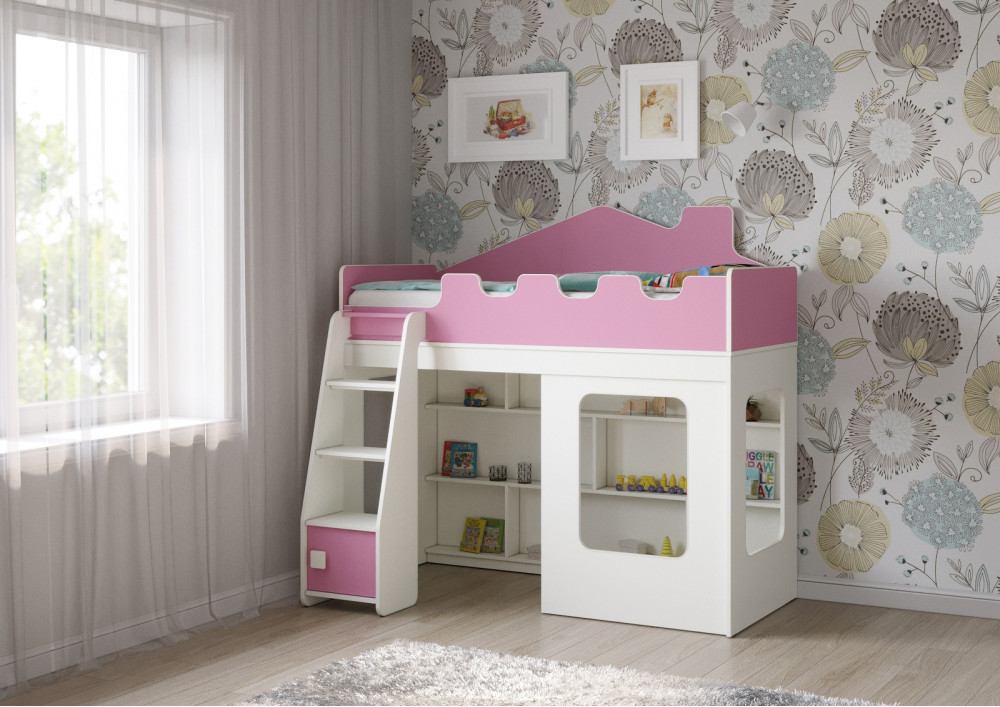Особенностью этой модели является наличие прямой лестницы с дверцей, которая не только придает кровати-домику особый шарм, но и обеспечивает легкий и безопасный доступ к спальному месту. Стеллаж, расположенный внизу спального места, предоставляет дополнительные возможности для хранения вещей и игрушек.