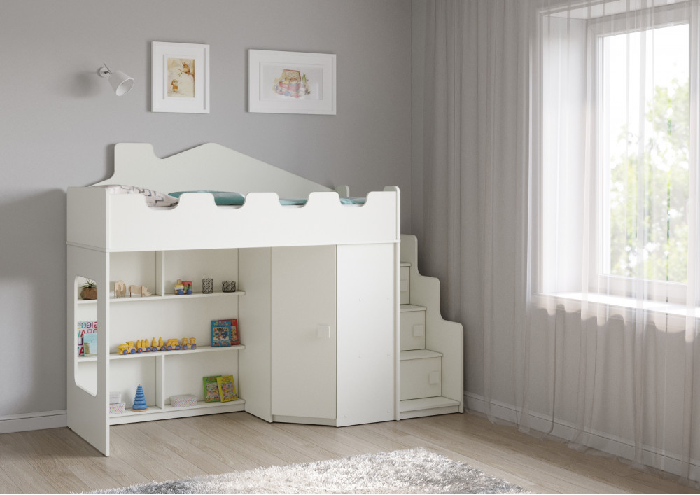 Эта модель кровати станет отличным выбором для вашего малыша. Благодаря угловой лестнице с дверцами и угловому шкафу, ребенок сможет легко и безопасно добраться до своего спального места, а также хранить свои игрушки и вещи в удобном месте.